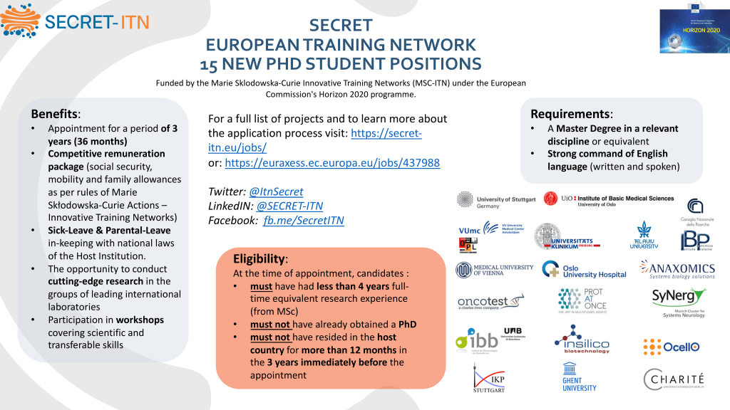 The SECRET ITN team members represent the University of Oslo (UiO), the University of Stuttgart (USTUTT), ProtAtOnce (PAO), VUmc School of Medical Sciences (VUmc), the Medical University of Vienna (MUW), Universitätsklinikum Freiburg (UKLFR), the Oslo University Hospital (OUH), Anaxomics (AX), the National Research Council of Italy (CNR), the Tel Aviv University (TAU) and Charles River Laboratories (CRDS).